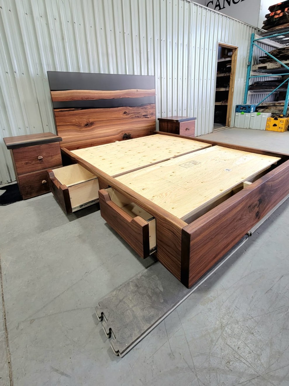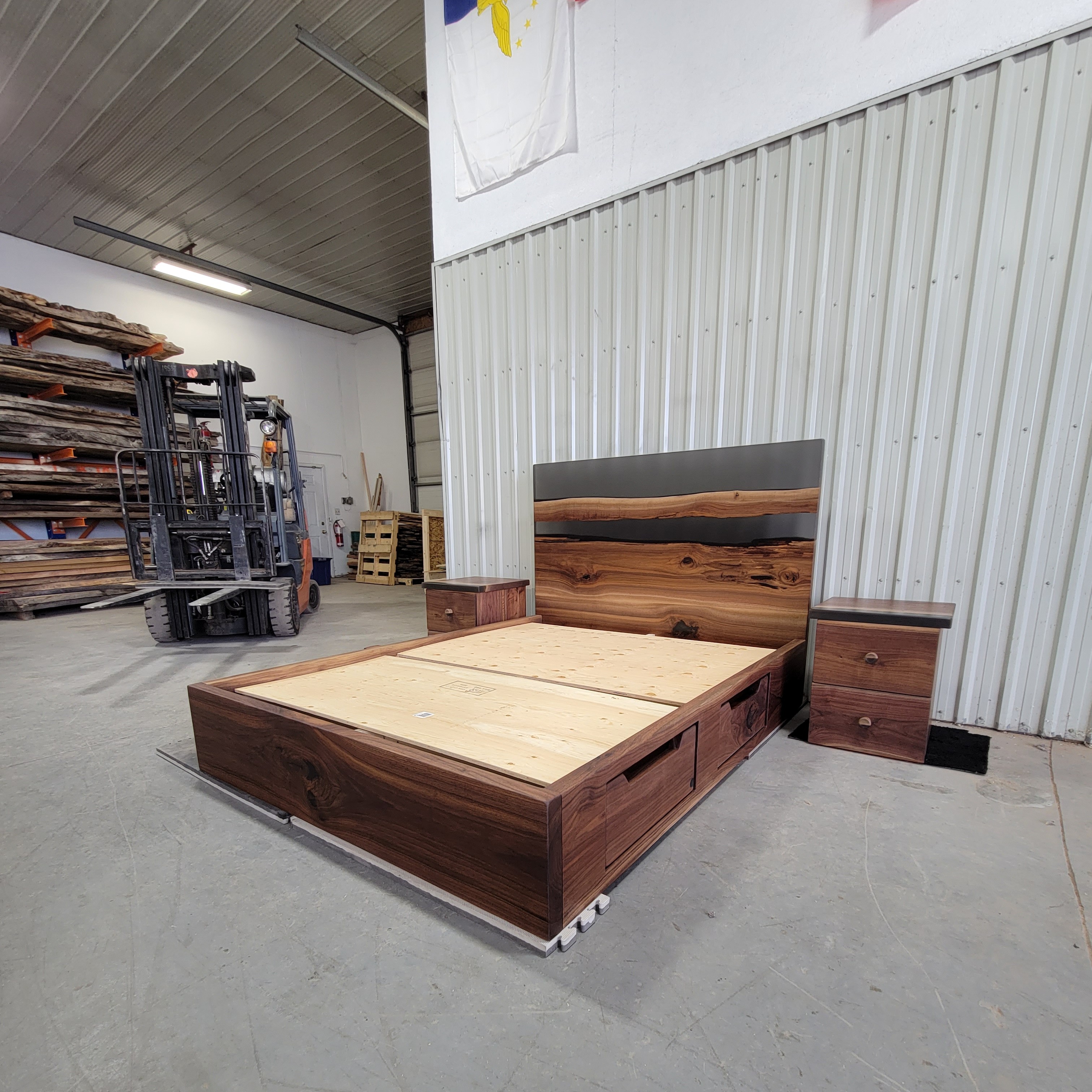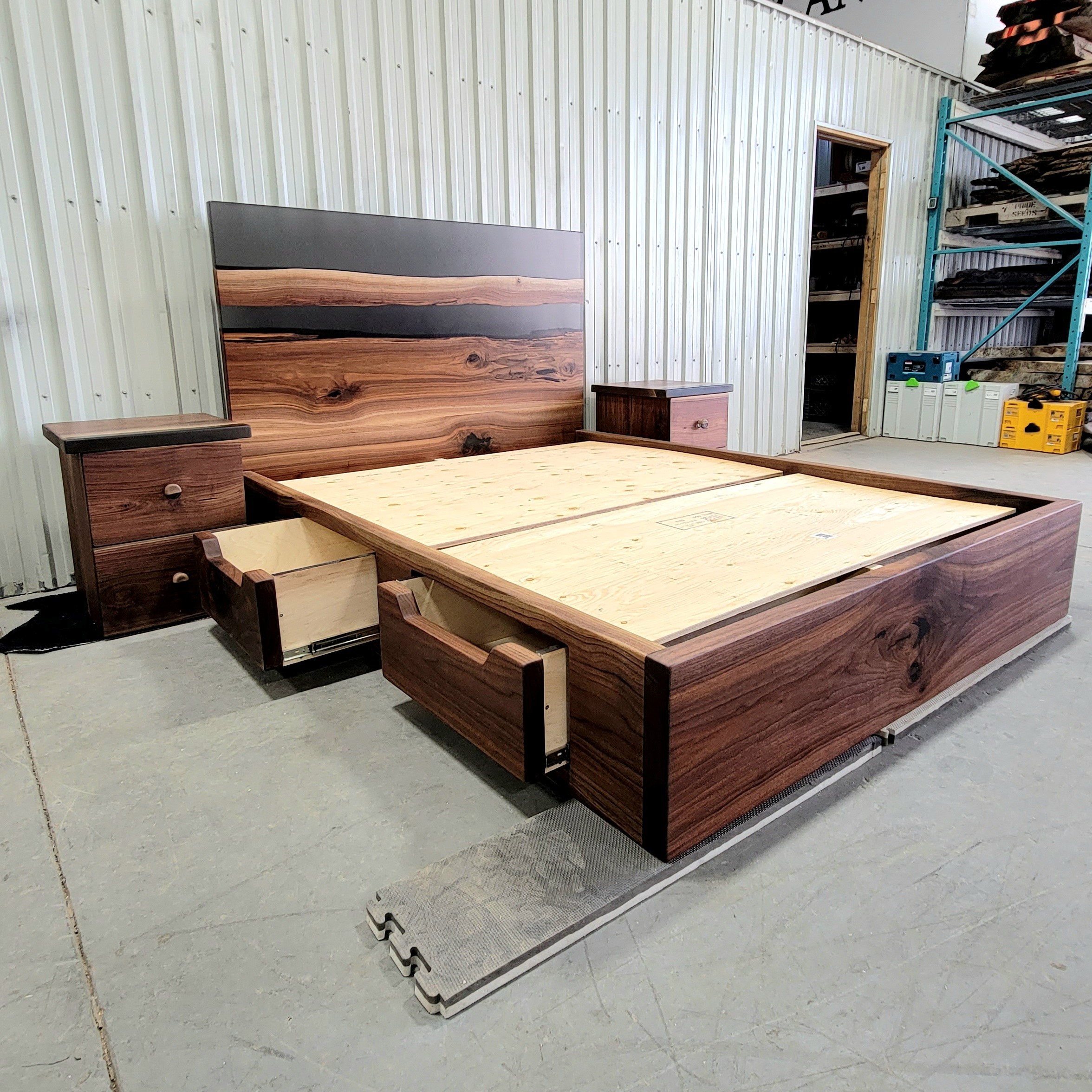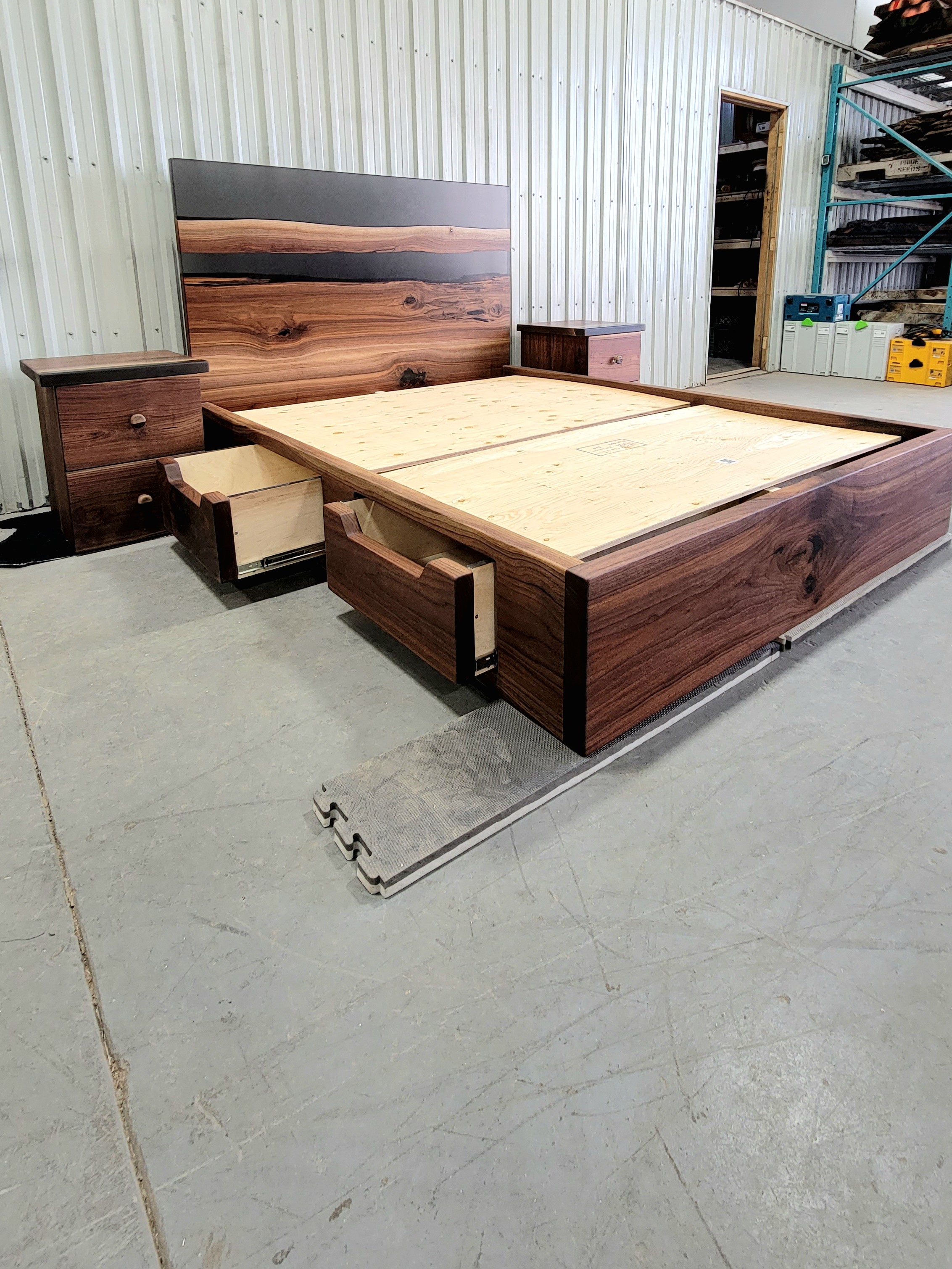 As Shown: Walnut and smoke epoxy Queen bed with matching nightstands.
