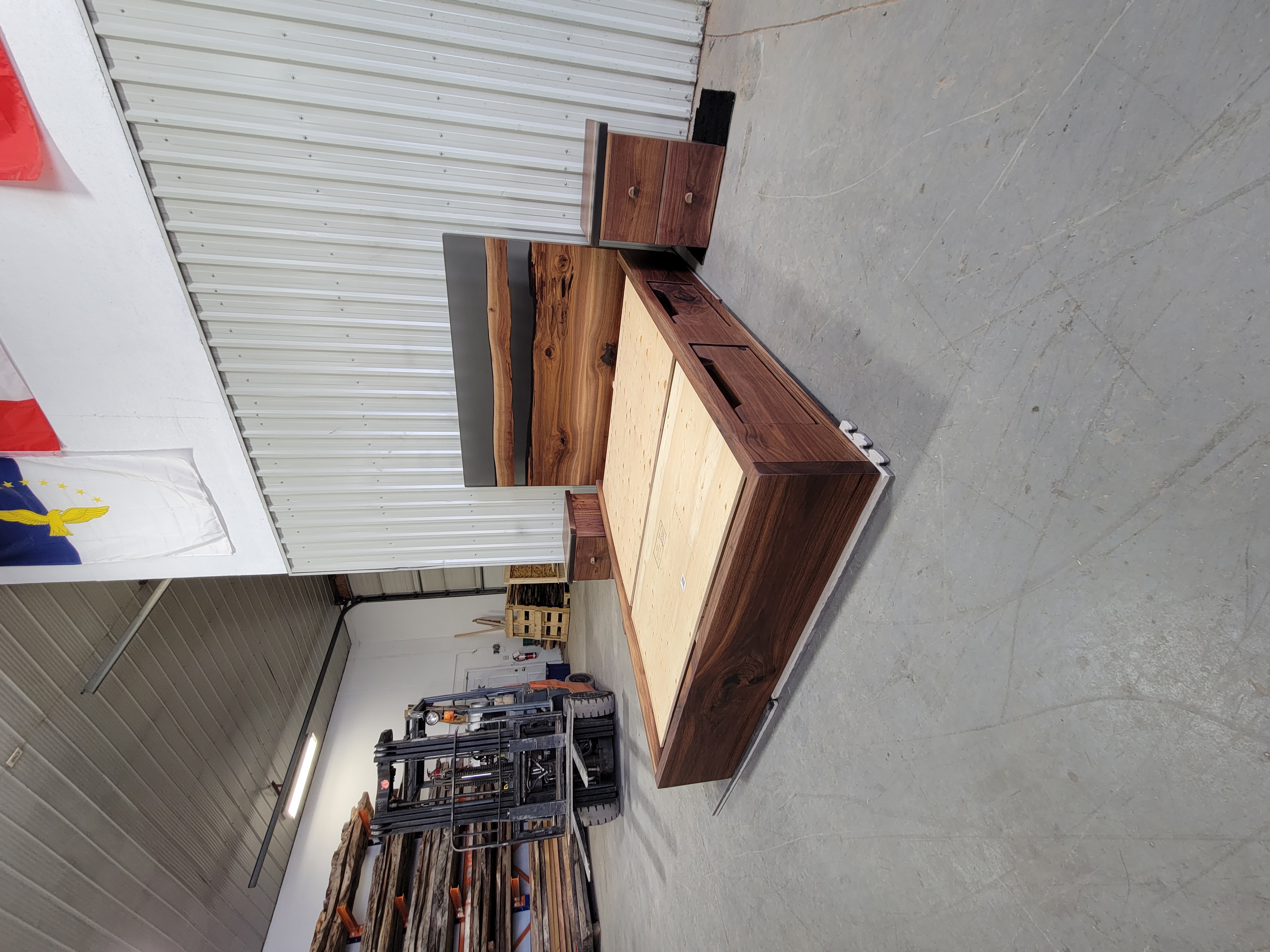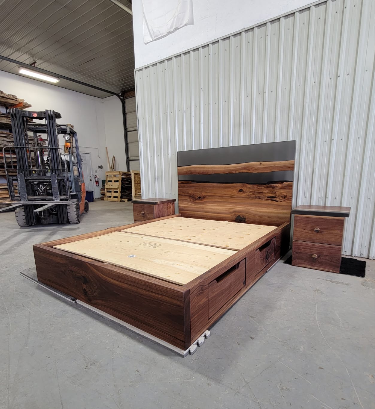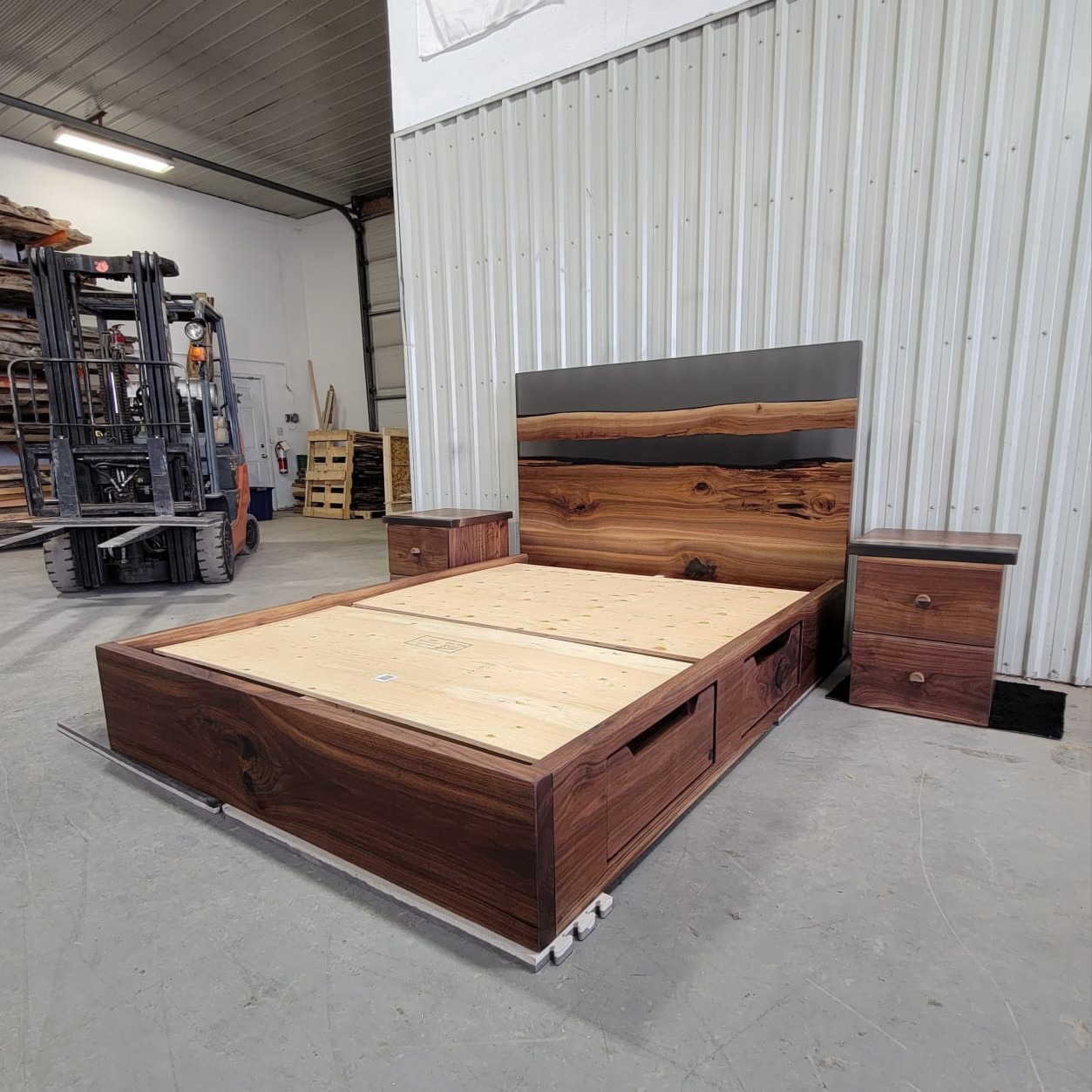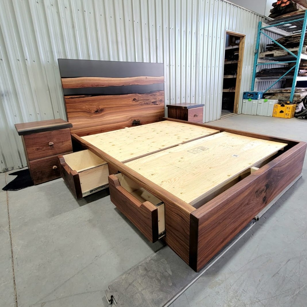 As Shown: Walnut and smoke epoxy Queen bed with matching nightstands.