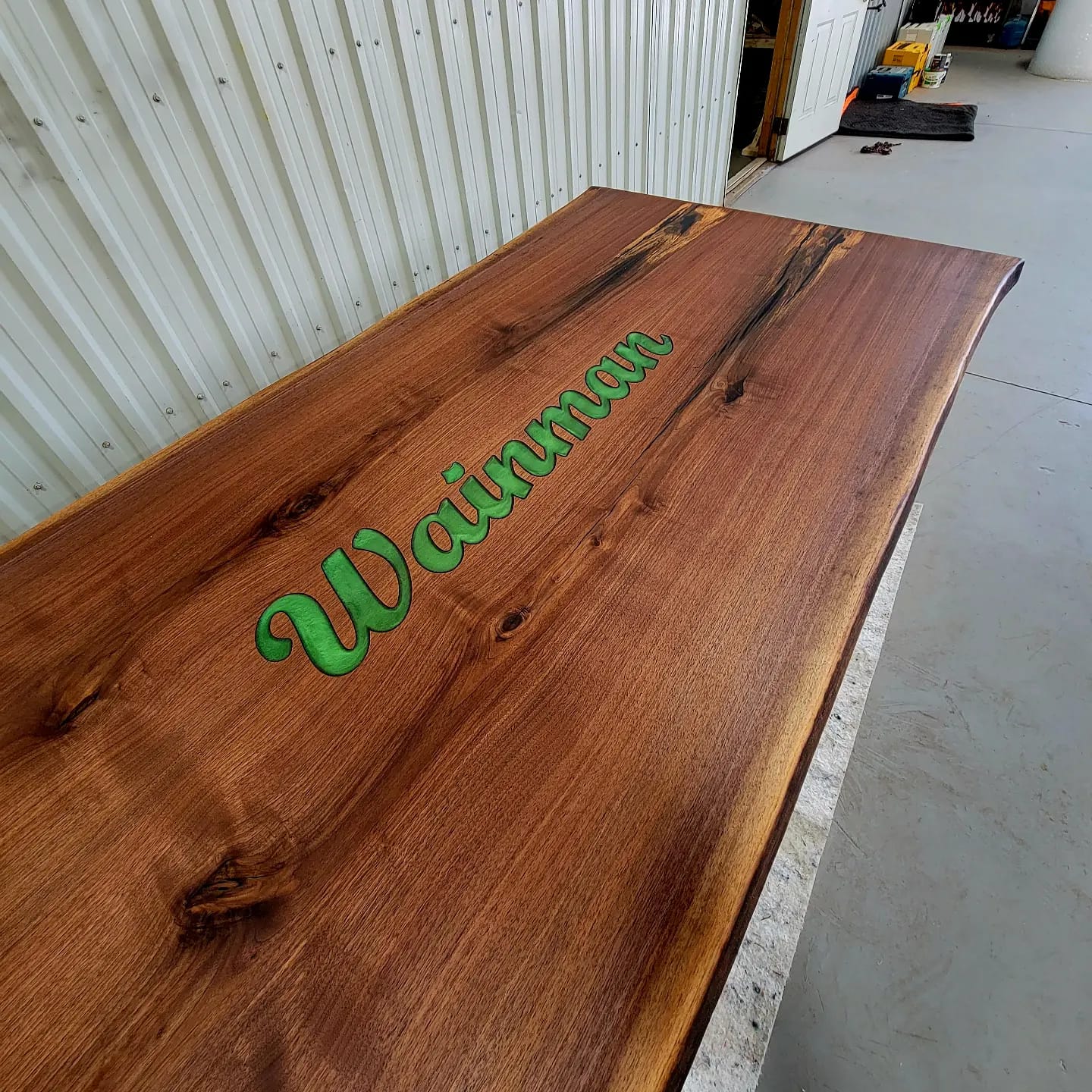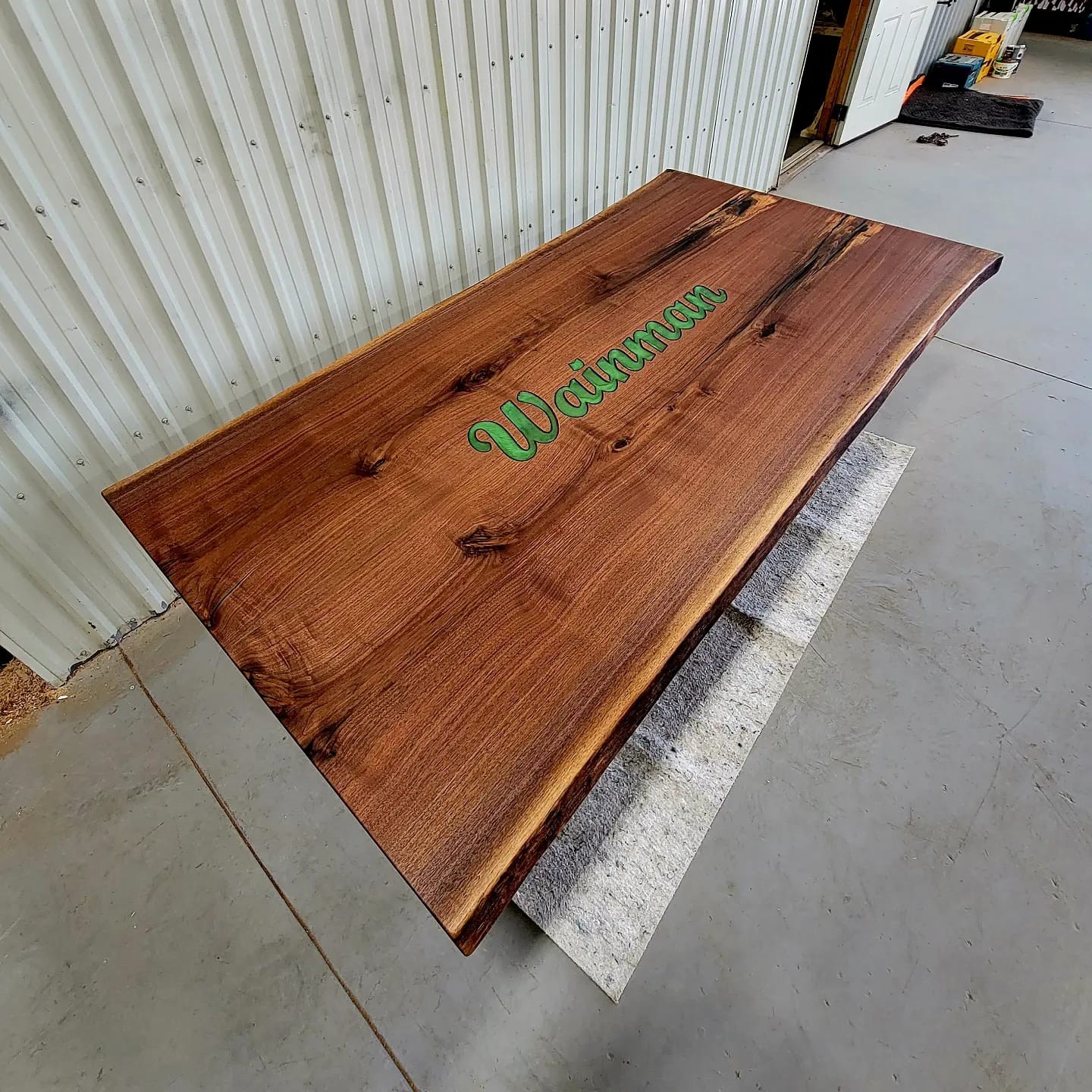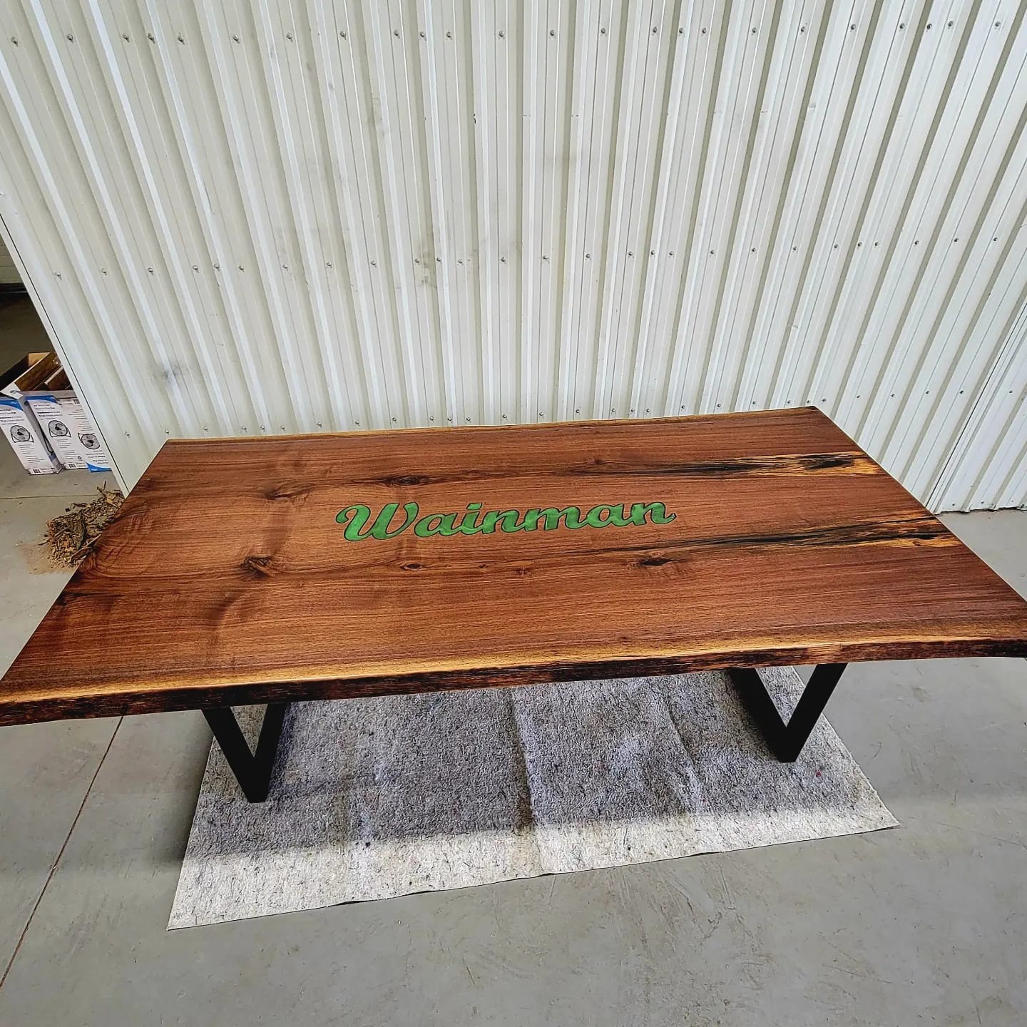 As Shown: Walnut Live Edge Custom Engraved and filled with a Green Epoxy and powder coated legs